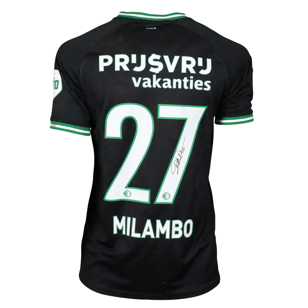 Date Authenticated: 29 January 2025 – Player: Antoni-Djibu Milambo – Team: Feyenoord – Season: 2024/2025 – Shirt Number: 27 – Shirt Size: M – Type: Worn, Signed – Period: 2nd half – Position: Midfielder – Born Date: 3 April 2005 – Born Country: Netherlands – Born City: Rotterdam
