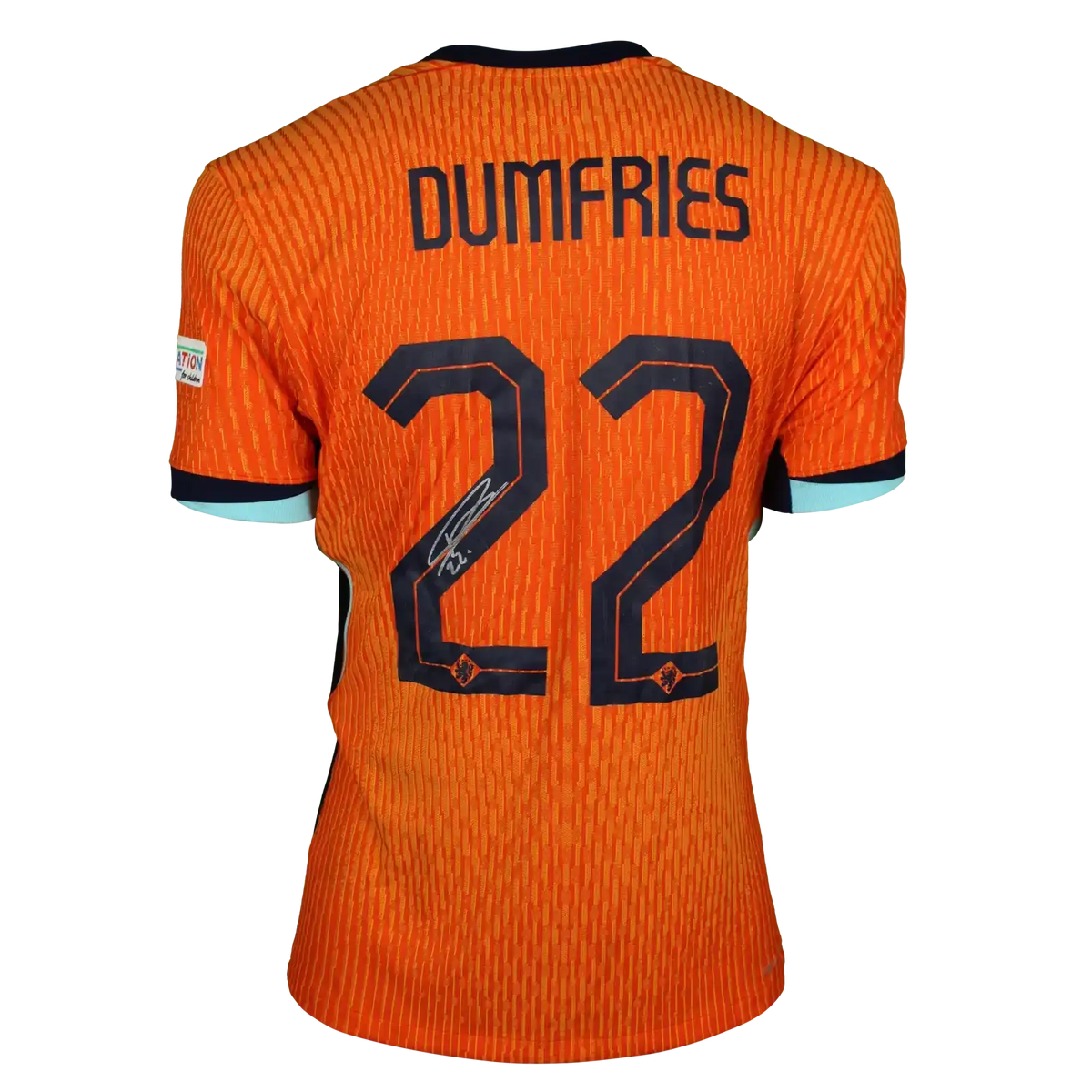 Match Worn Netherlands football shirt capturing Denzel Dumfries' pace and leadership on the international stage. This match worn, signed shirt carries the presence and purposeful energy supporters associate with Dumfries, presented in a short-sleeve cut that reflects on-field use. The signature is located on the back of the shirt, responsibly authenticated and preserved, and the shirt’s construction shows the tailored fit worn by elite international defenders.
