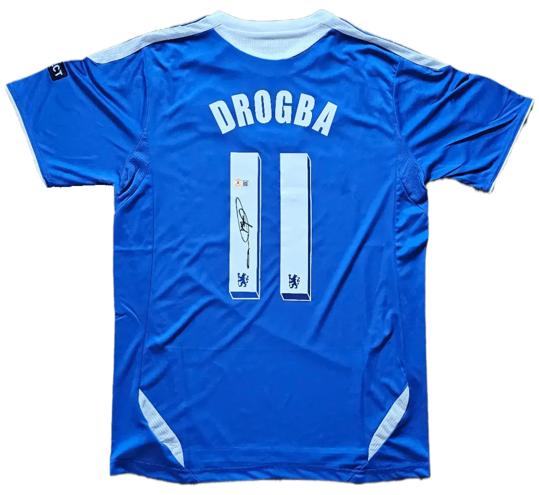 The shirt can be professionally framed with UV-protective glazing to preserve both the fabric and autograph. The Chelsea 2011-12 design with Beckett-certified signature and Champions League Final patches creates a premium display piece alongside the Beckett certificate of authenticity and comprehensive signing proof documentation, celebrating Drogba's legendary career.