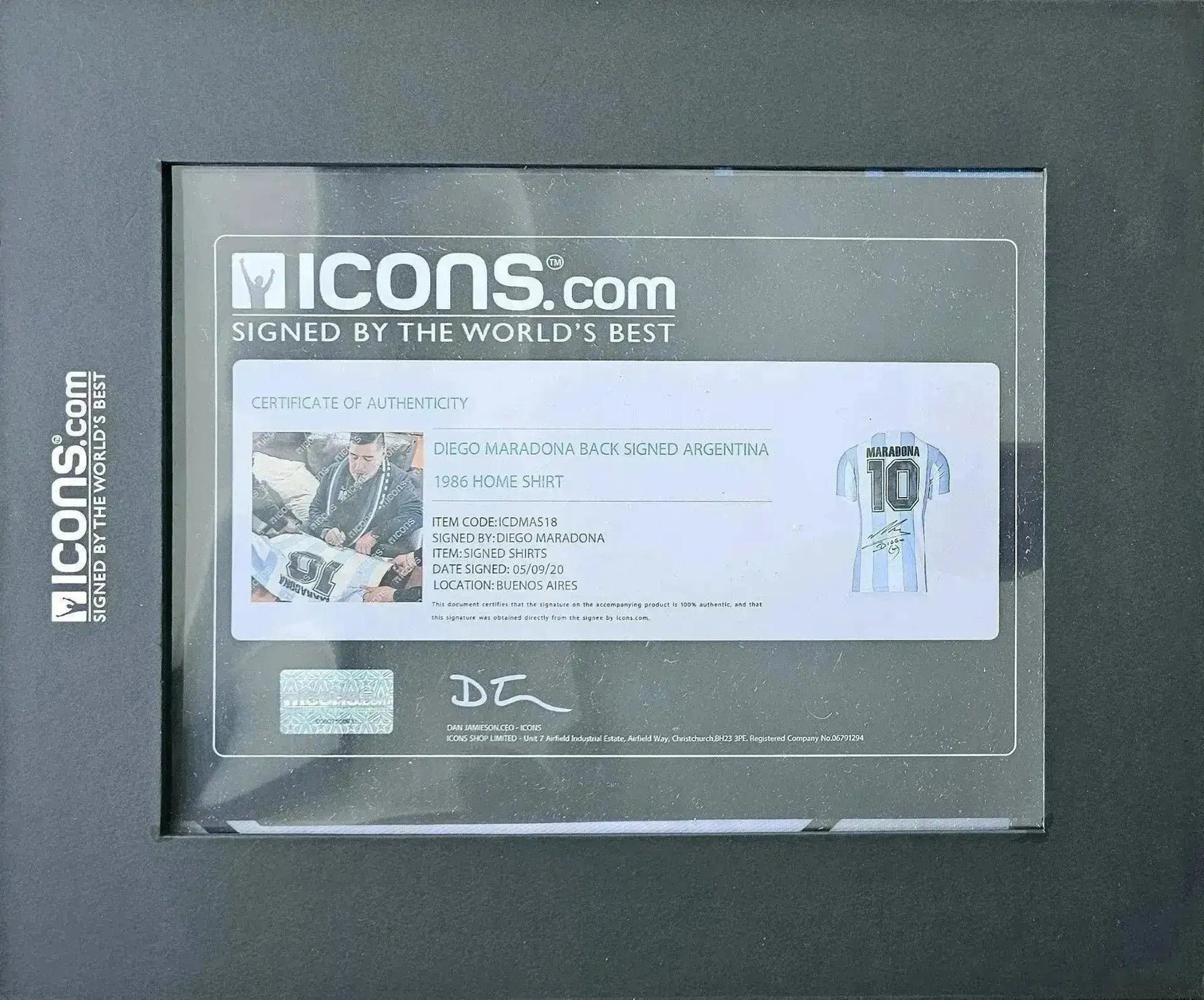 Player: Diego Maradona - Country: Argentina - Tournament: FIFA World Championship 1986 - Shirt: Fanshop Authentic - Packaging: Luxury Gift Box - COA: ICONS - Proof: Certificate of Authenticity (COA); Signing Session (Witnessed); Photo Proof