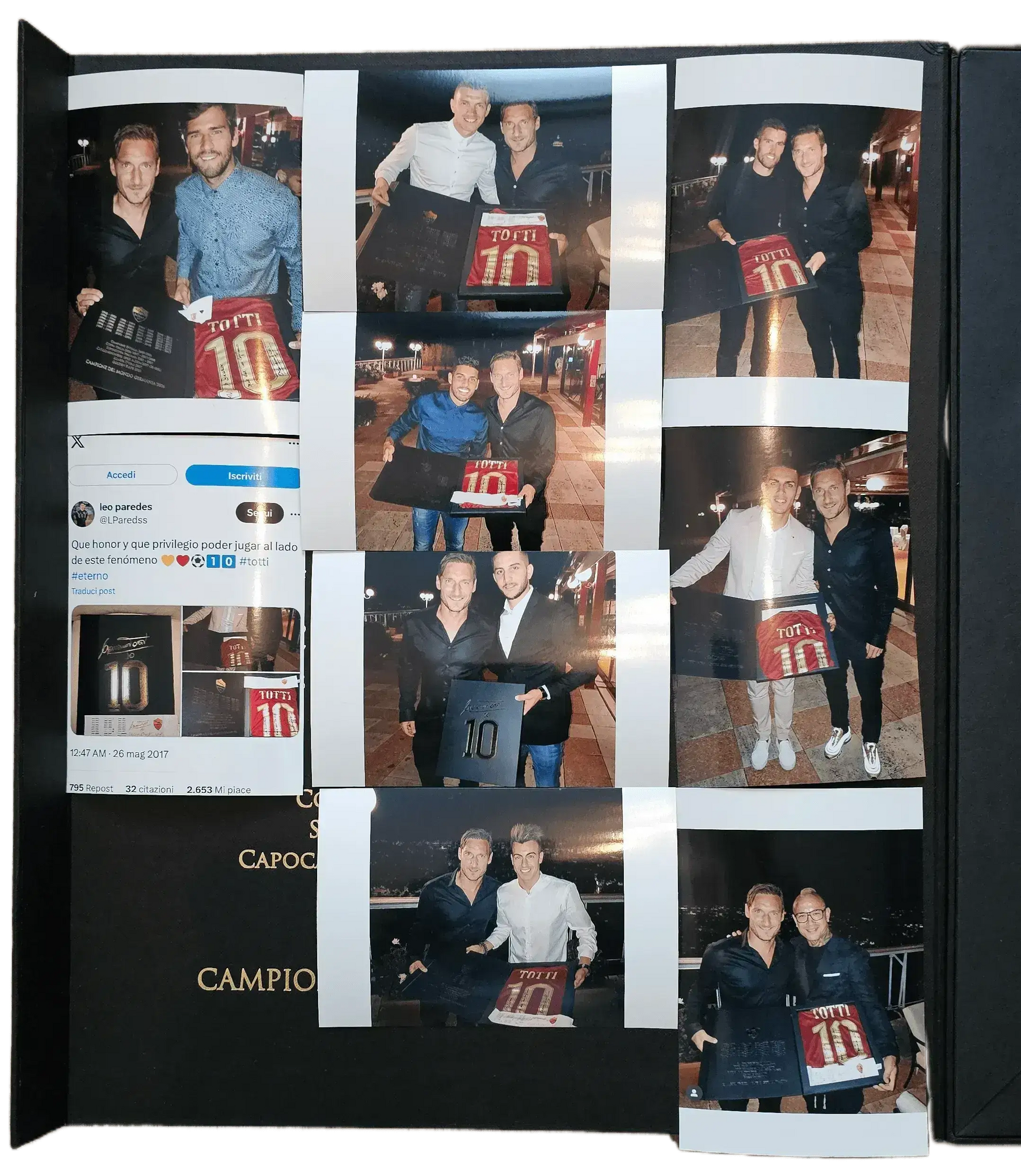 The 26 May 2017 farewell dinner took place on the terrace of the Cavalieri Hilton Hotel in Rome, one day after Totti's final Serie A match. Francesco Totti personally gifted these special box sets to his teammates as a farewell gesture. Each box contained a signed shirt with personal dedication, a captain's armband, and documentation of his 25-year career. Only teammates who attended the dinner received these gifts, making them among the rarest Totti memorabilia in existence.