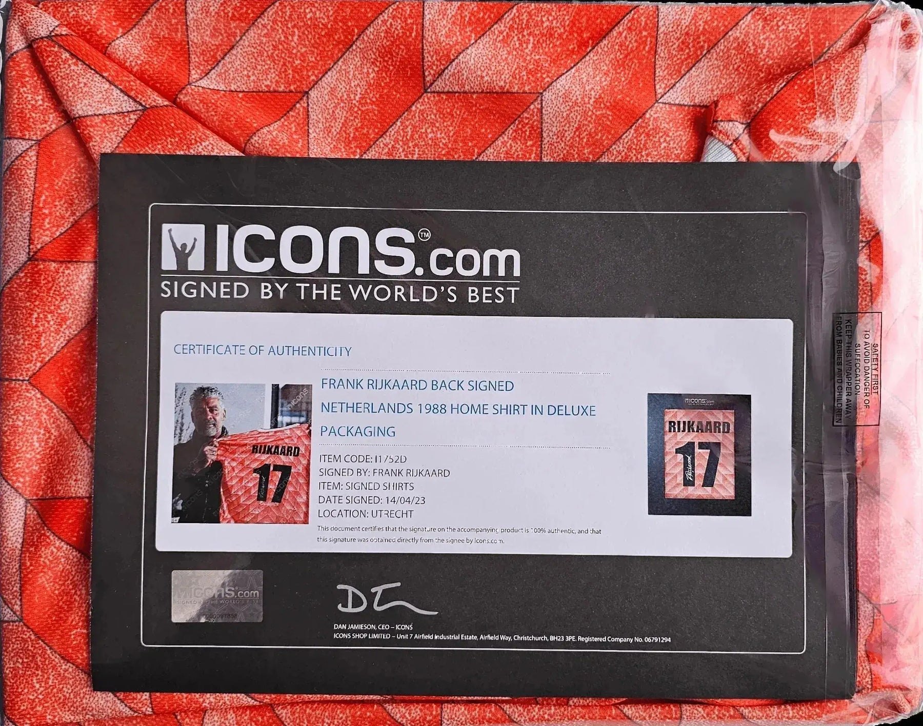 For display purposes, this signed football shirt can be professionally framed with UV-protective glazing to preserve both the fabric and autograph. The Holland 1988 design with Icons-certified signature creates a premium display piece alongside the Icons certificate of authenticity and comprehensive signing proof documentation, celebrating Rijkaard's legendary career.