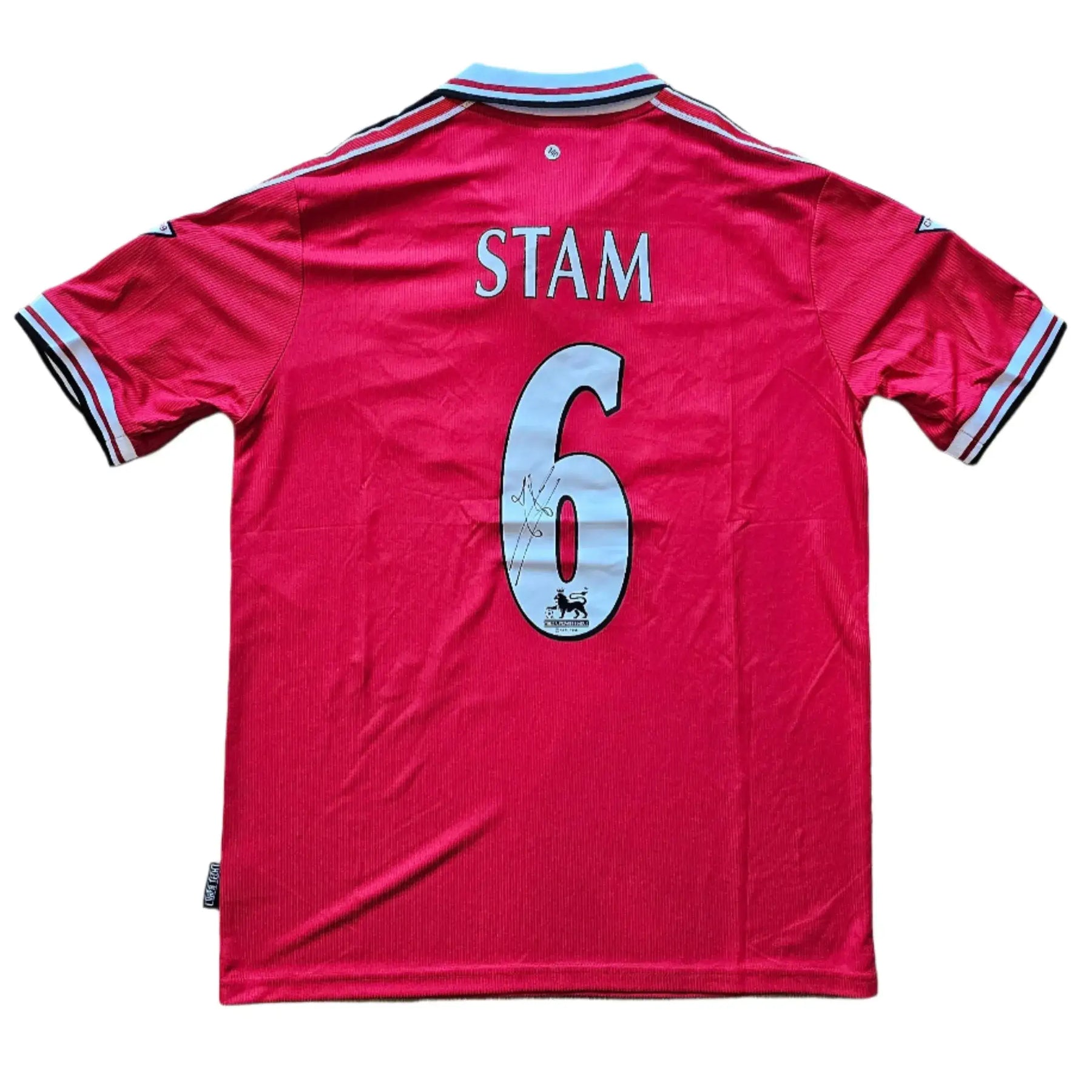 This signed Jaap Stam Manchester United 1998-99 football shirt celebrates one of the greatest seasons in football history. The shirt features number 6, worn by Jaap Stam during the legendary 1998-99 treble-winning campaign when Manchester United won the Premier League, FA Cup, and Champions League.