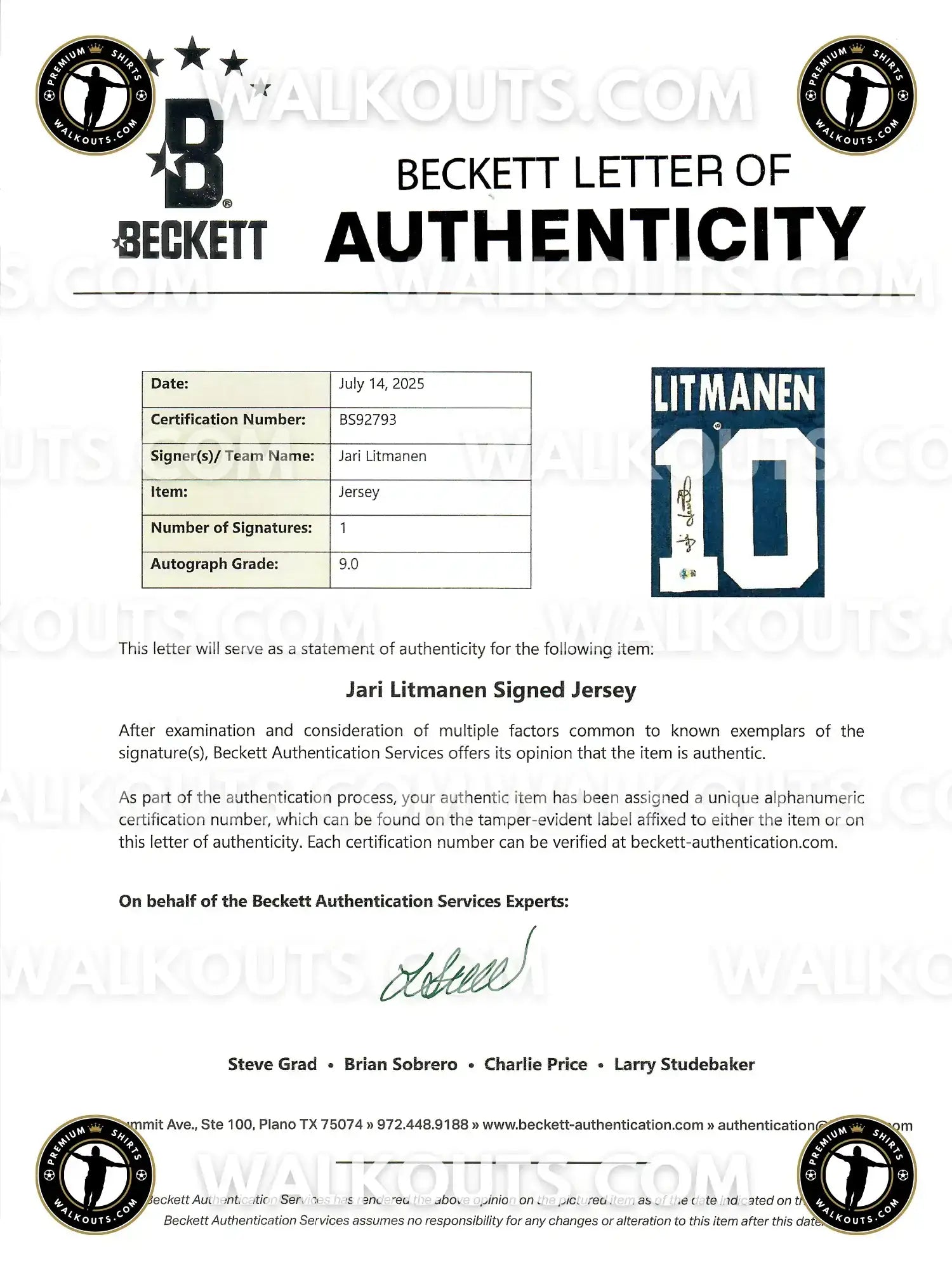 The Beckett certificate of authenticity with certification number BS92793 and autograph grade 9/10 provides premium third-party verification for collectors. The Beckett LOA confirms the signature authenticity and provides online verification at beckett-authentication.com. This is Litmanen's first Beckett certification, meaning Walkouts' signing proof was used to establish the player's signature in Beckett's authentication database for the first time. The autograph grade of 9/10 reflects excellent signature quality, while being the first Beckett certification for this legendary player adds exceptional collectible value.