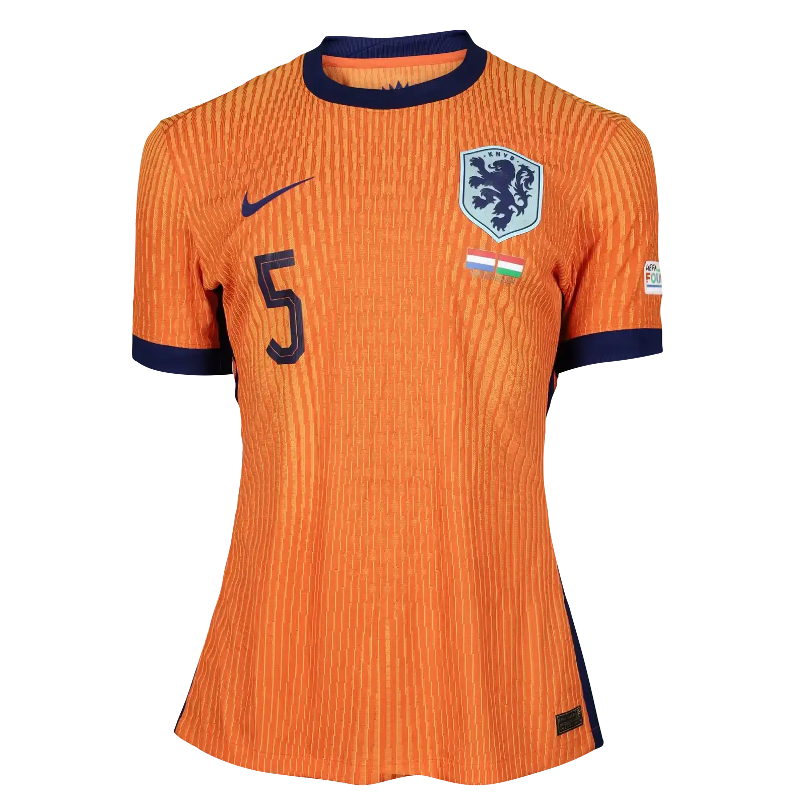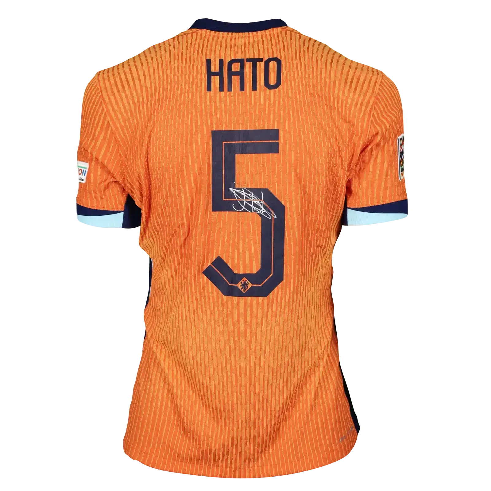 The shirt is a size L match-worn in excellent condition, featuring Netherlands' design with national crest and manufacturer details. The number 5 and HATO nameset are applied in the official font, representing the shirt worn during this UEFA Nations League encounter.