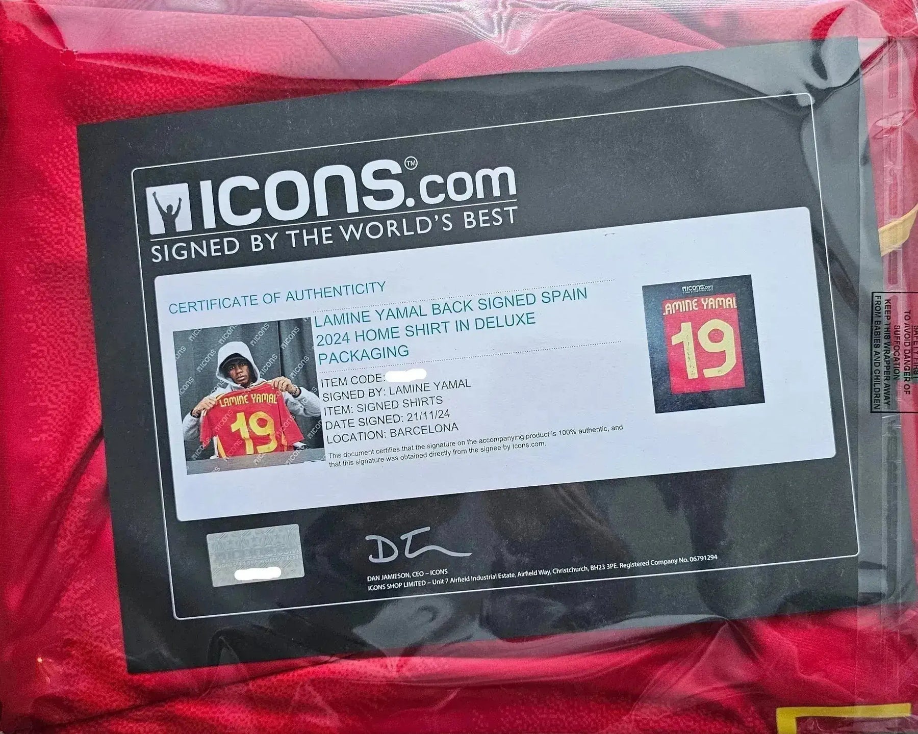 This shirt was signed by Lamine Yamal on 21 November 2024 during an official signing session and authenticated by ICONS, with signing photo, video proof, and signature proof providing comprehensive visual documentation. The ICONS certificate of authenticity with certification number 0000103412 provides premium third-party verification. This shirt comes from the inaugural signing batch under the ICONS COA, creating authentication for collectors of Spanish football and Euro 2024 memorabilia.