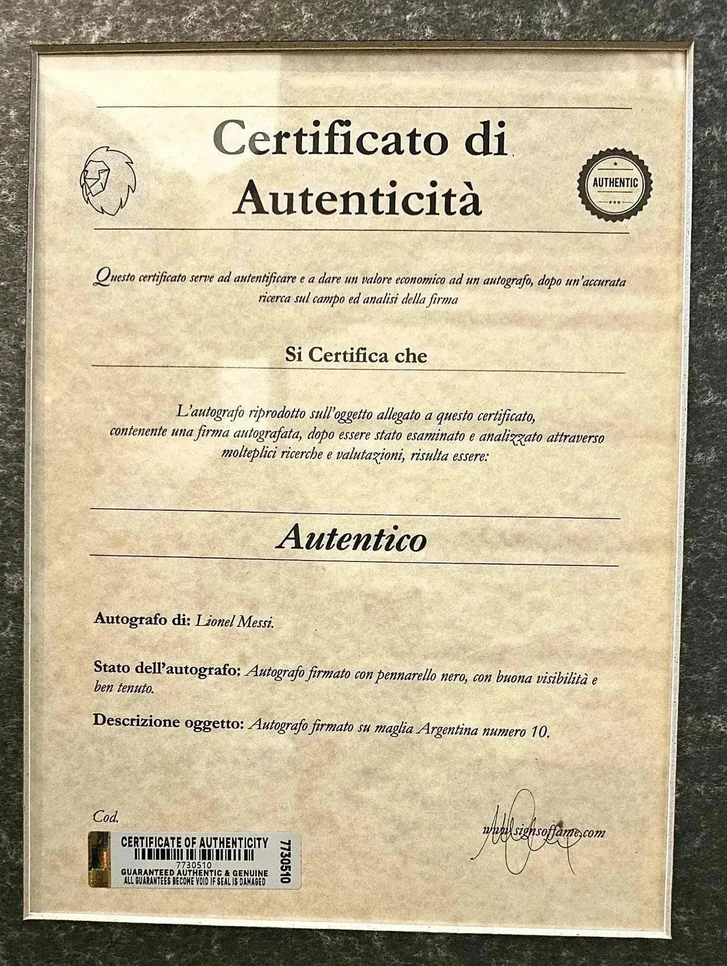 The signature on this shirt is authenticated by Signs of Fame, a testament to its genuineness and the integrity of its provenance. The signature's flow and pressure speak volumes of Messi's confidence and his connection with the fans, making it a rare collector's item that transcends its monetary value.