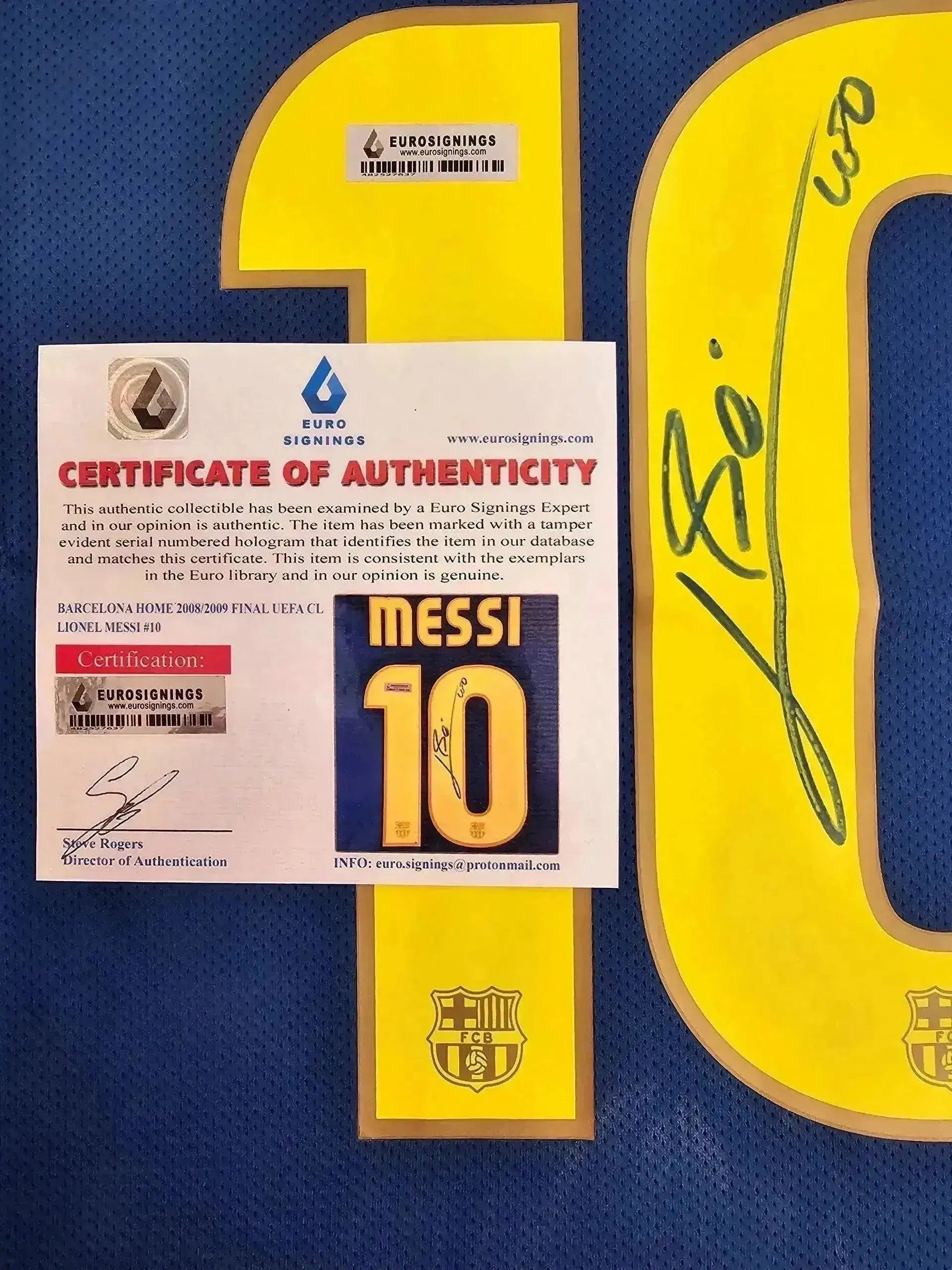 This shirt was signed by Lionel Messi and authenticated by Euro Signings, with Walkouts signing proof including signing photo providing comprehensive visual documentation. The Euro Signings certificate of authenticity with certification number 482527637 provides third-party verification, creating authentication for collectors of Barcelona and Champions League memorabilia.