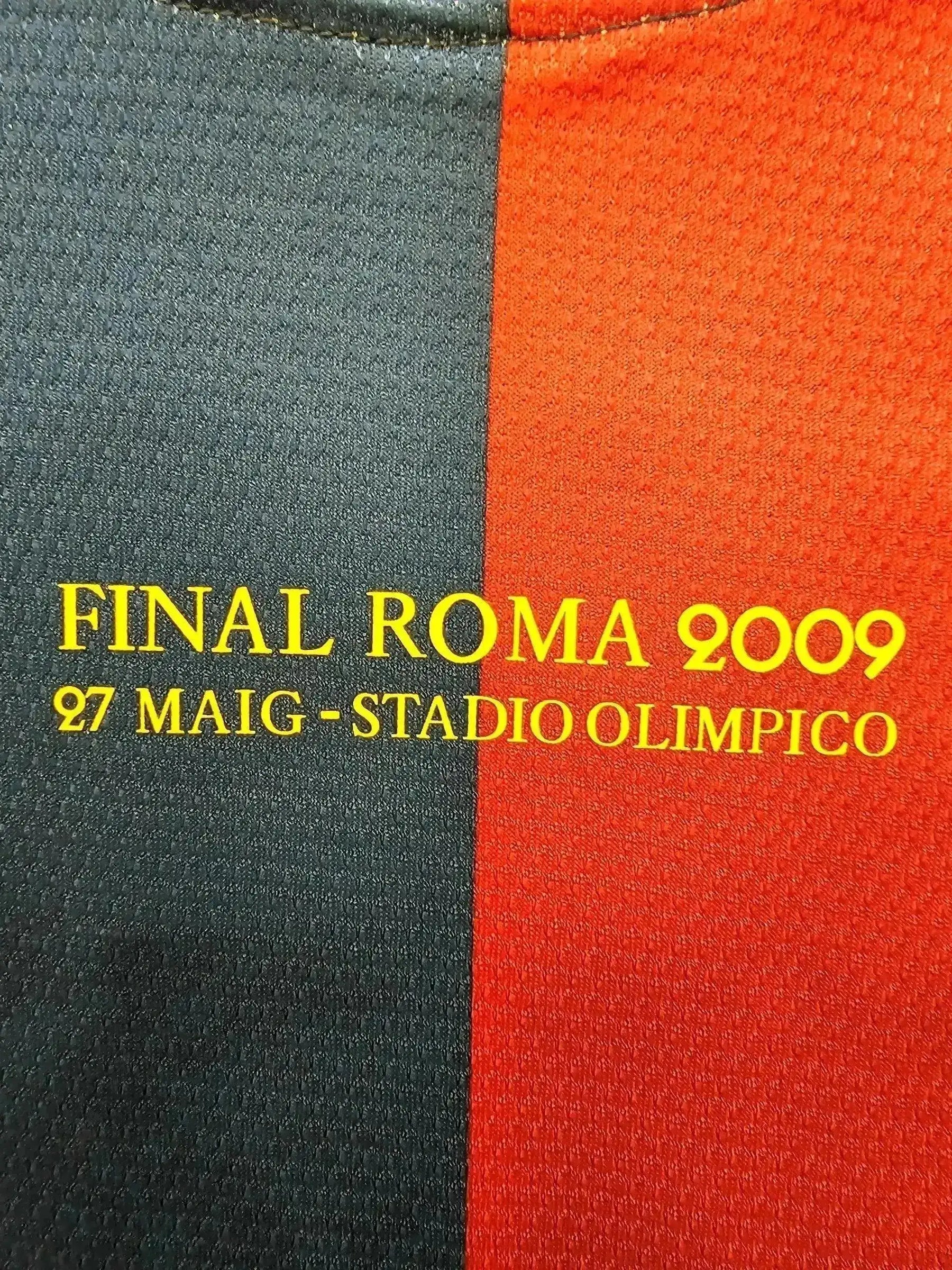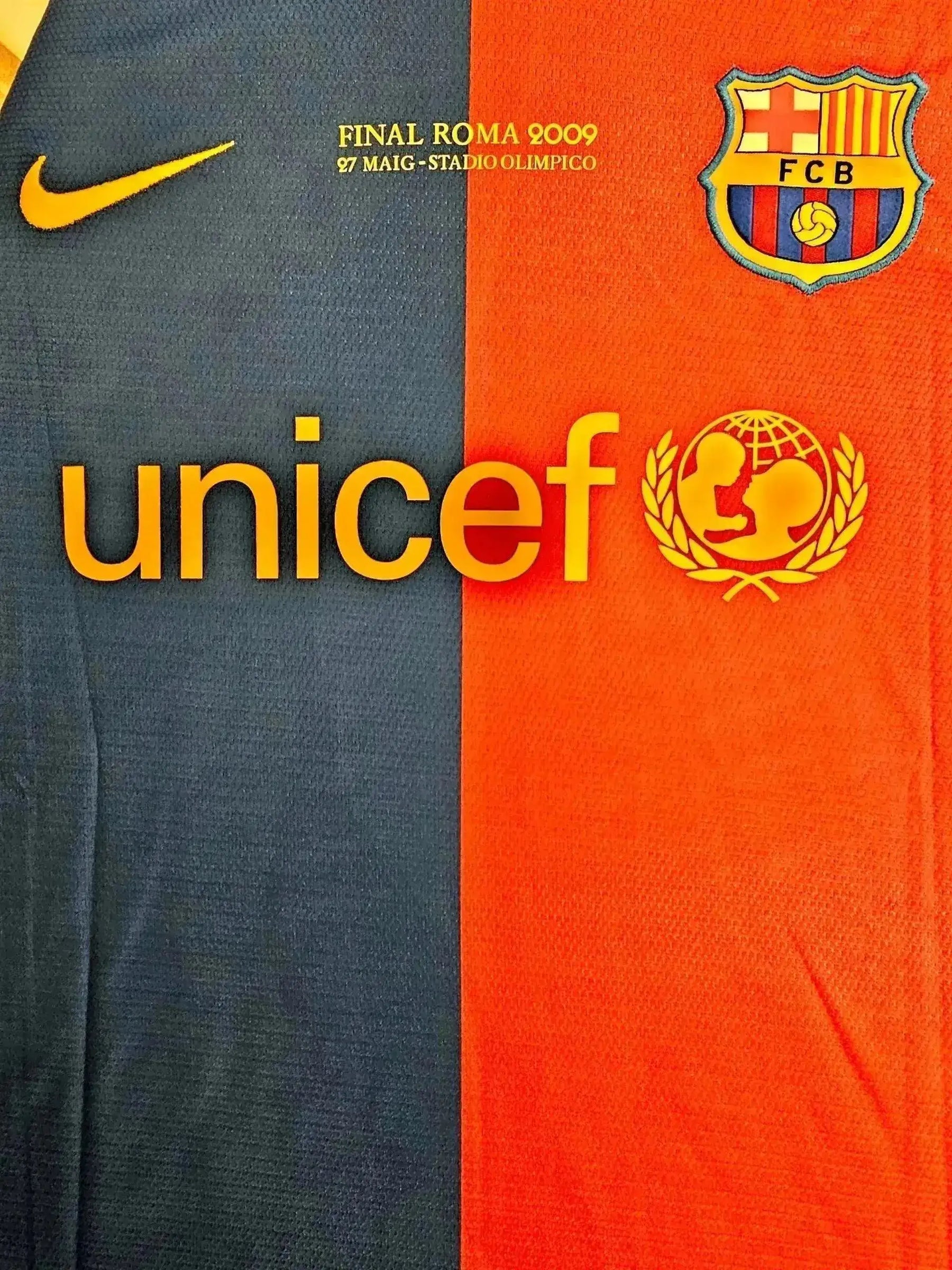 The 2008-09 season saw Barcelona win the treble under Pep Guardiola, defeating Manchester United 2-0 in the Champions League final at the Stadio Olimpico in Rome. Lionel Messi scored 38 goals in all competitions and won his first Ballon d'Or. Barcelona won La Liga, Copa del Rey, and Champions League in one of the greatest seasons in club history. This shirt celebrates Messi's breakthrough treble season.