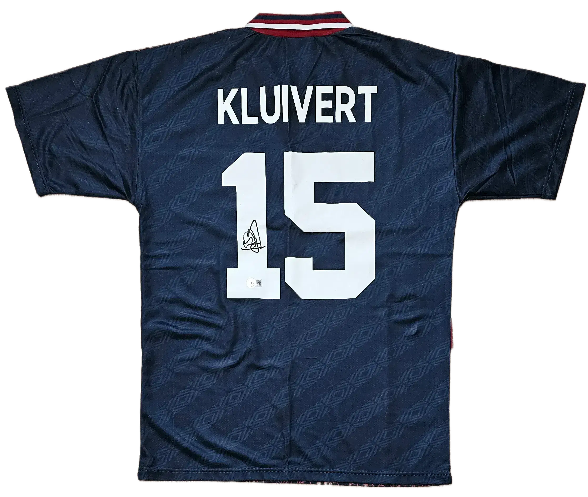 Don't miss the opportunity to enshrine the spirit of the '90s Ajax and the early brilliance of Patrick Kluivert. This dark blue design with its meaningful signature is a gem awaiting its rightful place in your esteemed collection of soccer antiquities.