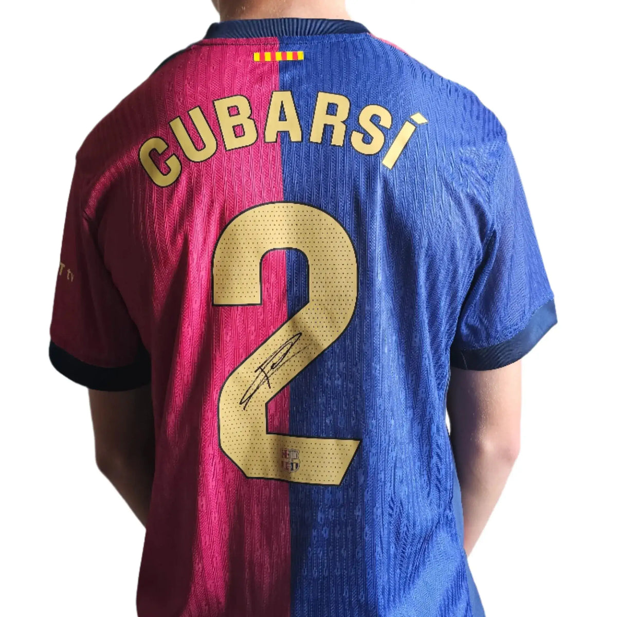 This signed shirt is the official away edition for the 2024–25 season, featuring a sleek black design with subtle accents, reflecting the club's modern aesthetic. Crafted with high-quality materials, the shirt bears Cubarsí's signature, making it a valuable collector's item for fans and enthusiasts.