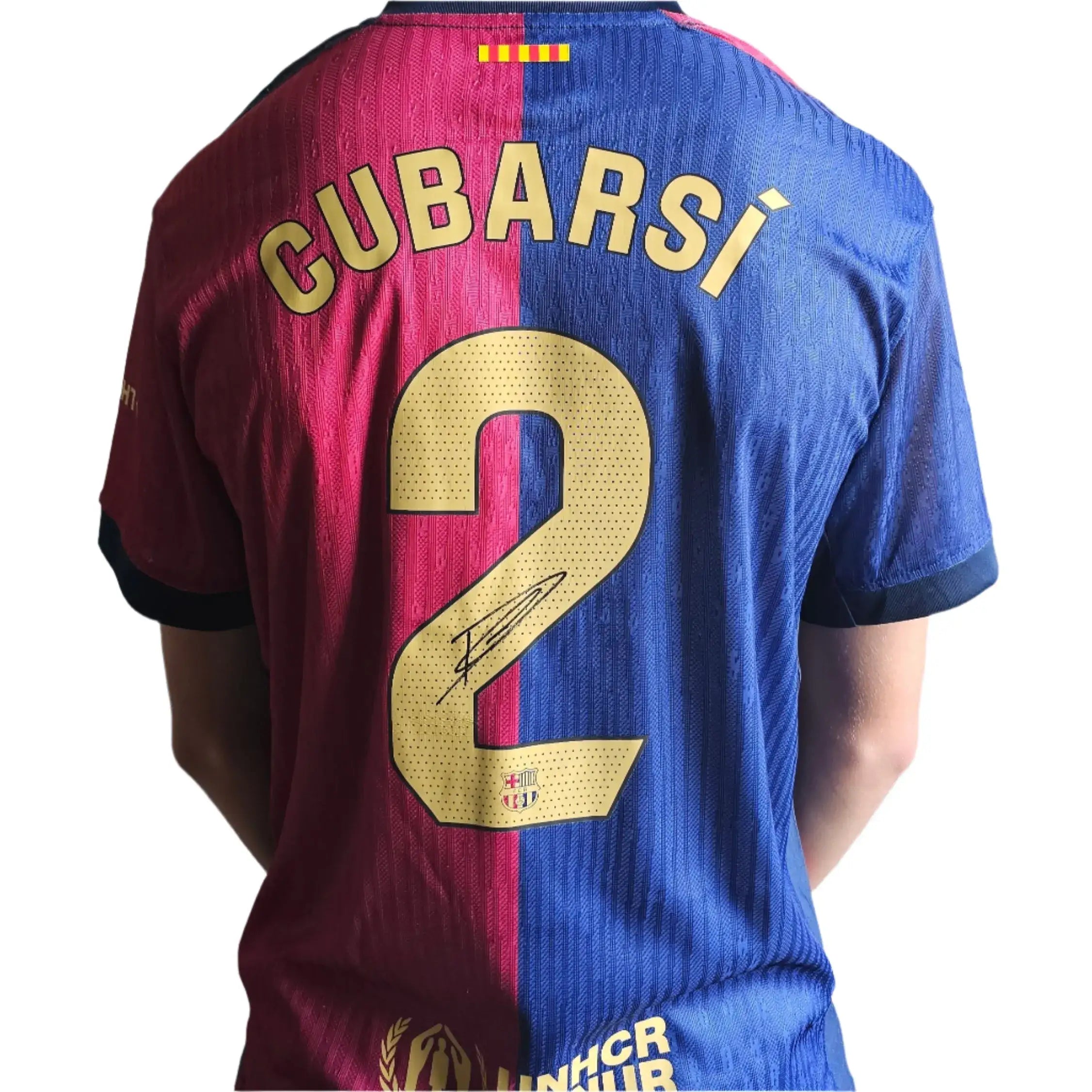 This signed jersey is the official away edition for the 2024–25 season, featuring a sleek black design with subtle accents, reflecting the club's modern aesthetic. Crafted with high-quality materials, the jersey bears Cubarsí's signature, making it a valuable collector's item for fans and enthusiasts.