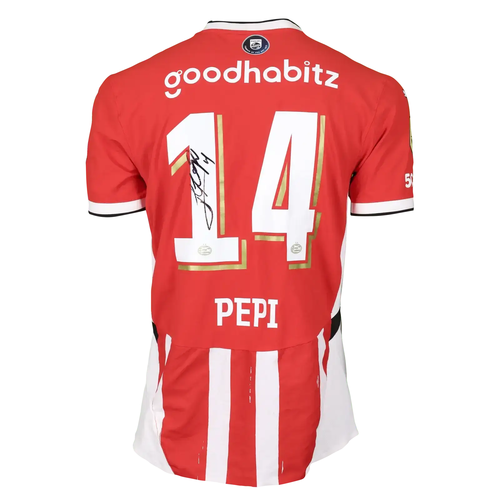 Fabricks classification: Worn, Signed. Full match worn. Goal scored: 85'. Shirt number: 14. Nameset: PEPI. Size: L. Sleeve: short. Signing date: 6 December 2024. Match date: 6 December 2024. Venue: Philips Stadion, Eindhoven. Competition: Dutch Eredivisie, 2024-25 regular season. Result: PSV Eindhoven 6-1 FC Twente.