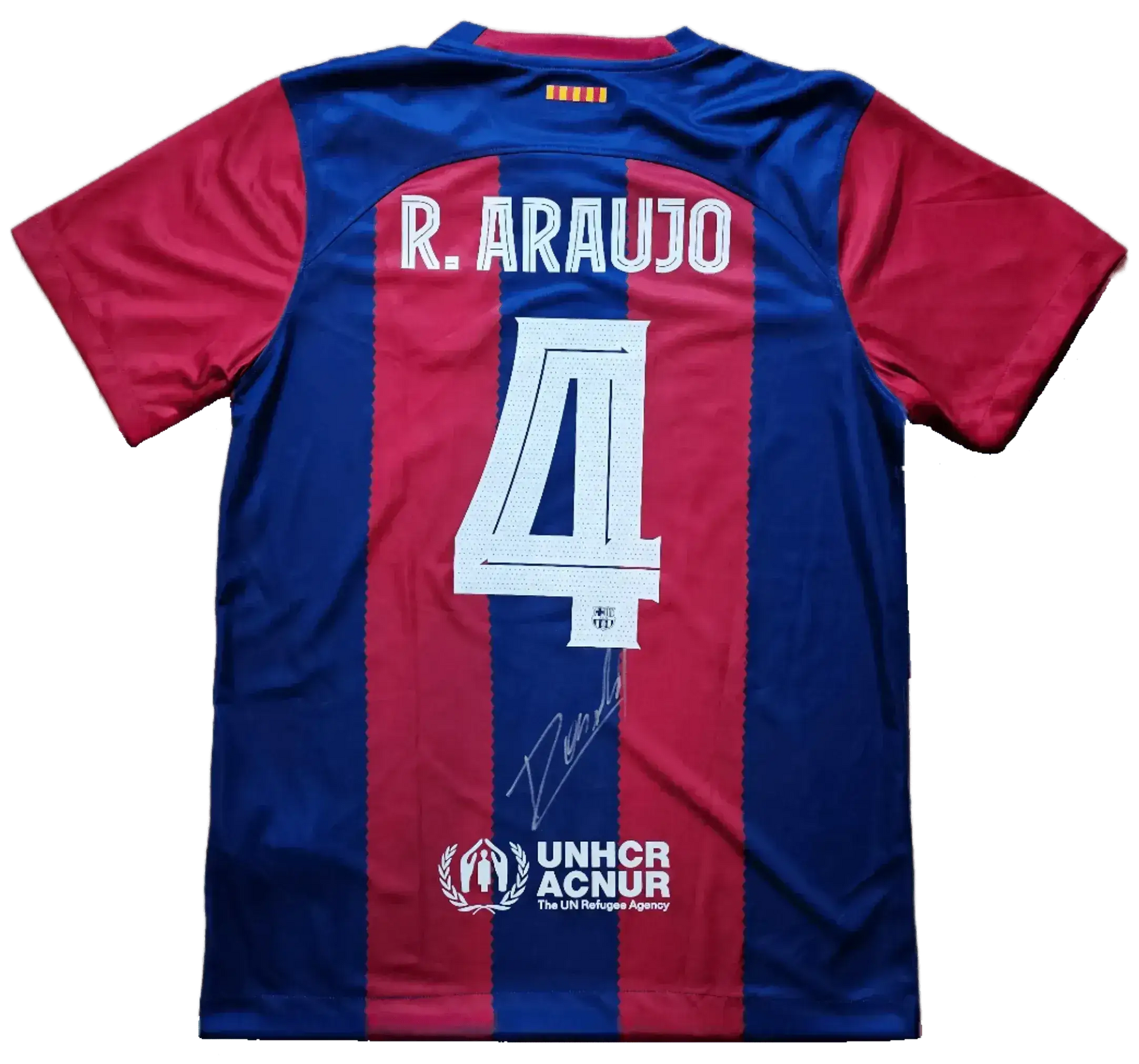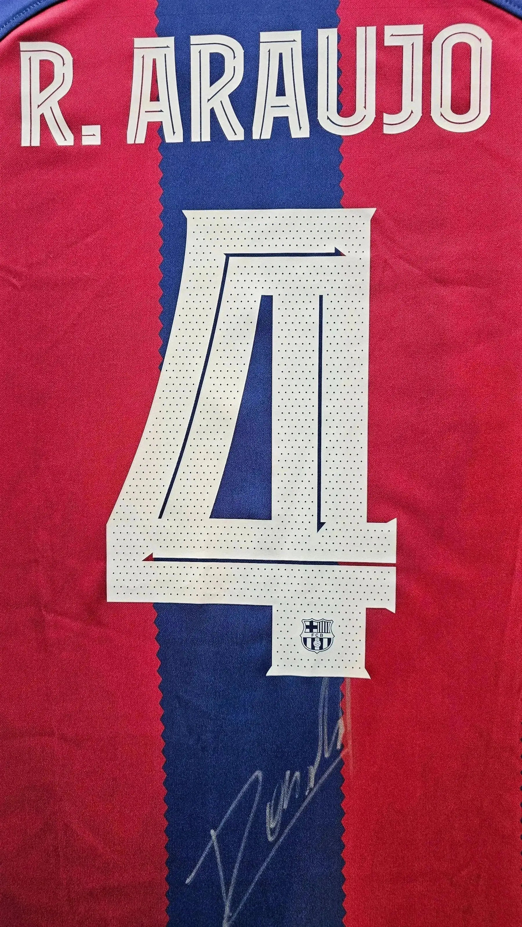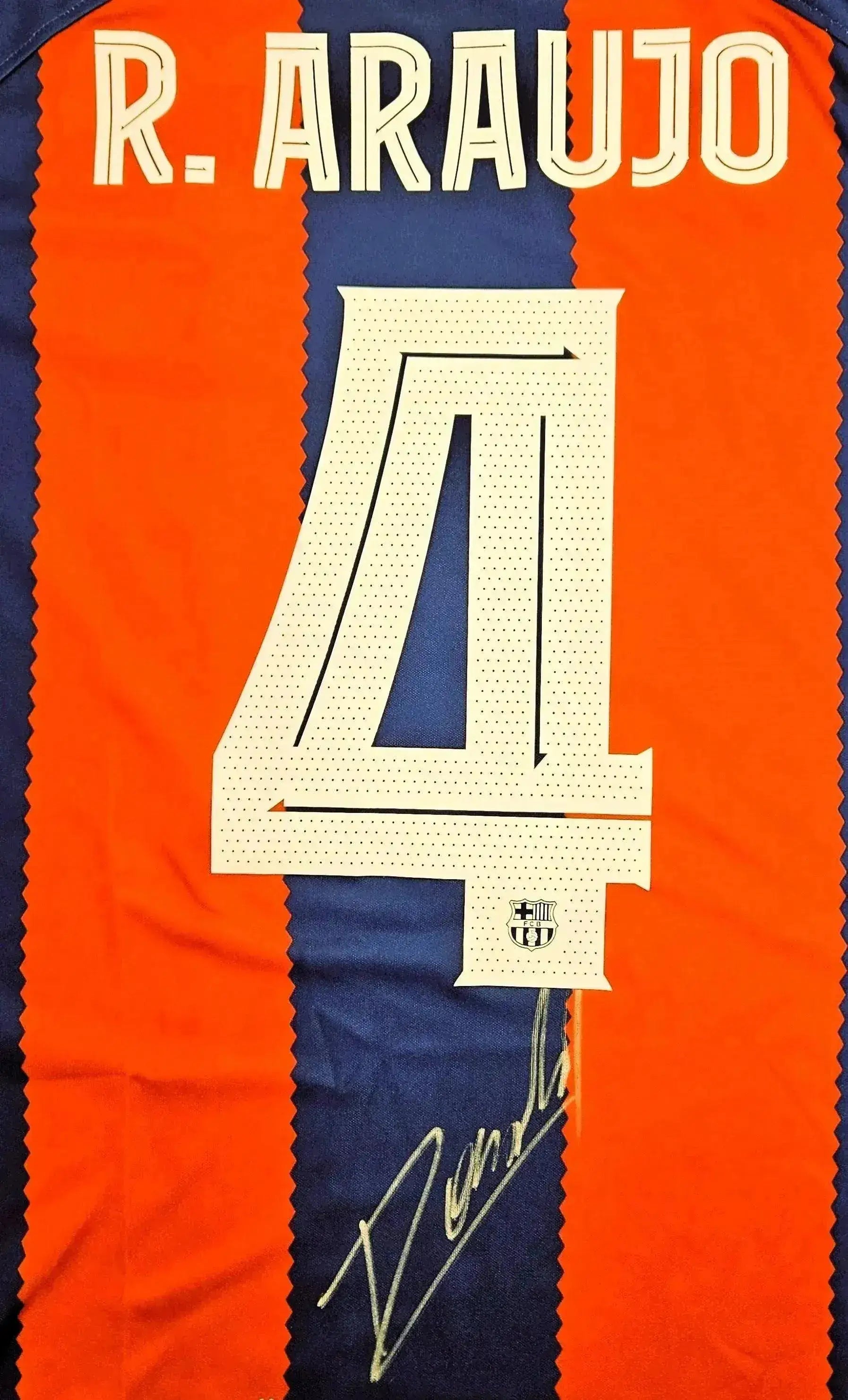 This signed Ronald Araújo Barcelona 2023-24 football shirt celebrates a Uruguayan defender who plays for FC Barcelona. The shirt features number 4, representing Araújo's role in Barcelona's 2023-24 campaign.
