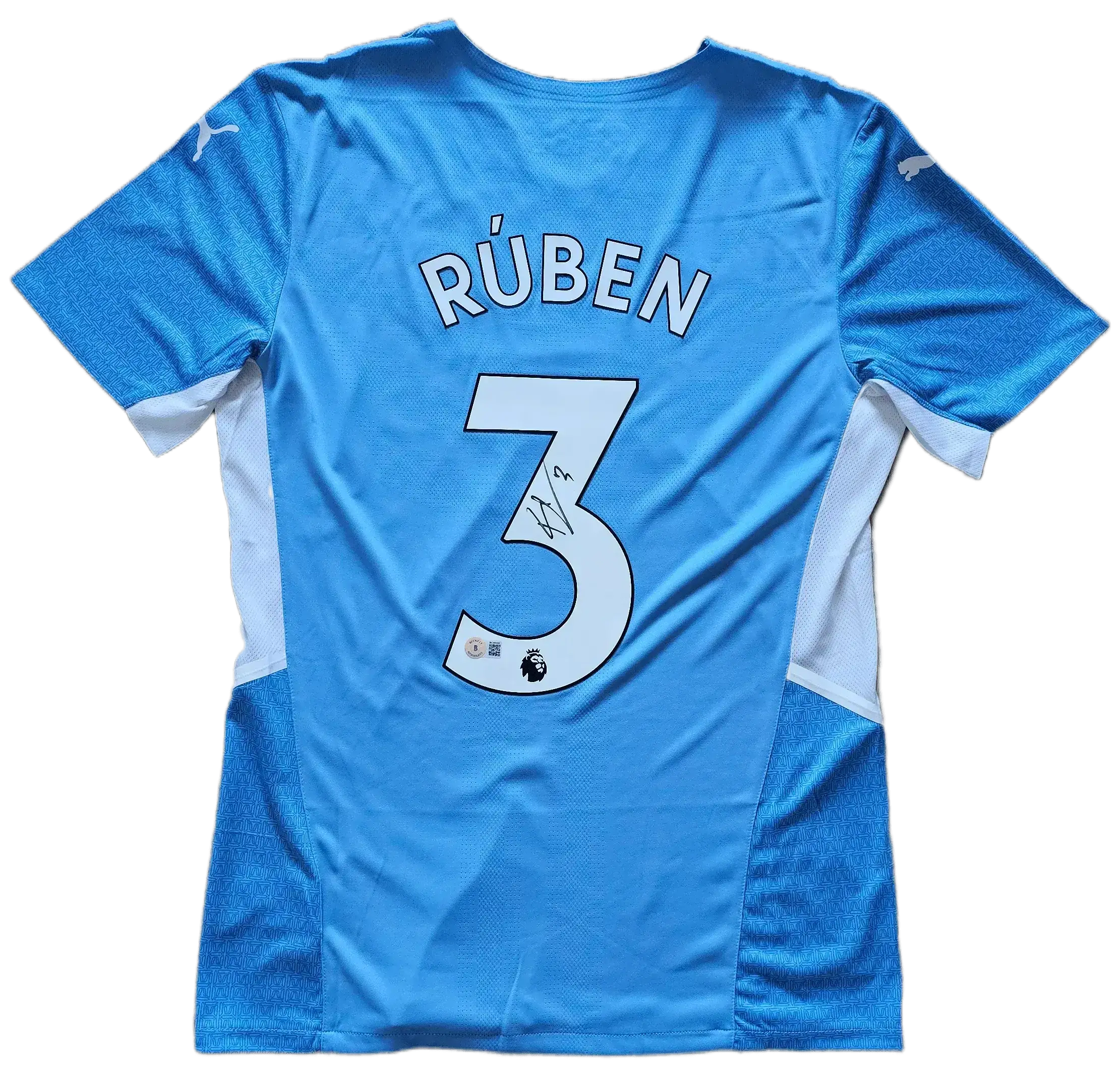 Embrace a piece of Manchester City's recent history with the Rúben Dias #3 2021-2022 Home Kit — a signed soccer shirt that encapsulates both the spirit of a Premier League giant and the essence of a defensive maestro. This official Puma Manchester City home shirt proudly bears the signature of Rúben Dias, authenticated by Beckett, a leading name in sports memorabilia verification.