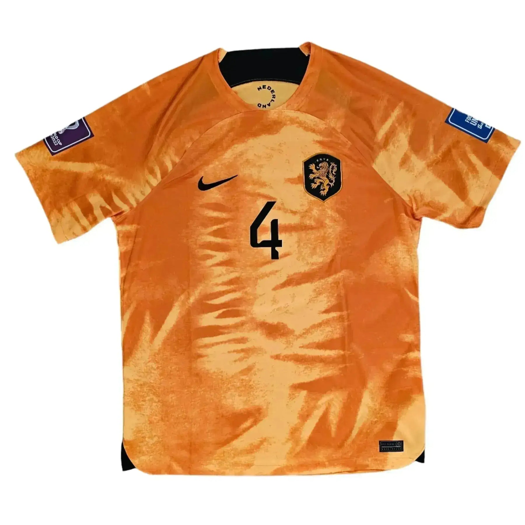 The 2022 World Cup saw Netherlands reach the quarter-finals in Qatar, with Virgil van Dijk captaining the team. Van Dijk led the Dutch defense throughout the tournament, showcasing his leadership and defensive prowess on football's biggest stage. Netherlands advanced from the group stage and defeated the United States in the round of 16 before falling to Argentina on penalties in the quarter-finals. This 2022 World Cup shirt represents Van Dijk's leadership of the Dutch national team.